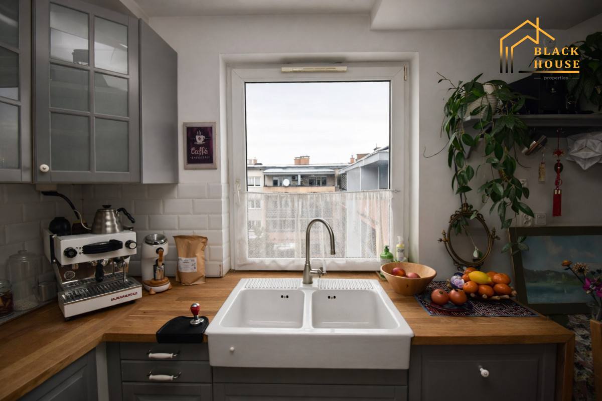 Mieszkanie jest bardzo klimatyczne - duża ilość roślin, naturalne światło oraz przytulne wykończenie tworzą wyjątkową, spokojną atmosferę. Ostatnie piętro zapewnia ciszę, prywatność oraz otwartą przestrzeń za oknami.