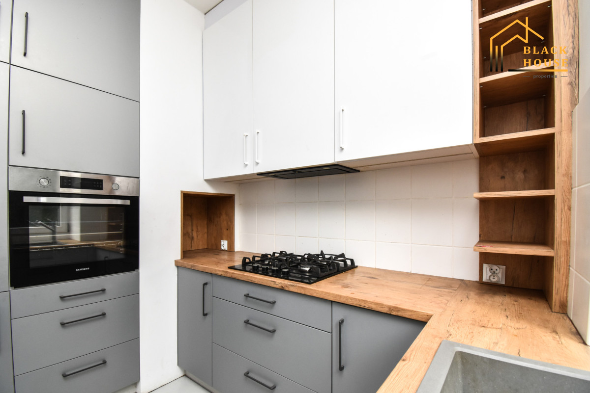 - osobna kuchnia z zabudową meblową, piekarnikiem, płytą gazową i pojemnymi szafkami